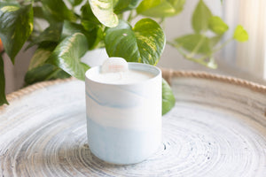 Each Good Thoughts candle is poured in a gorgeous ceramic vessel and includes an engraved keepsake stone and gift box. Seven varieties are available: balance, courage, dream, faith, gratitude, love, and purpose.